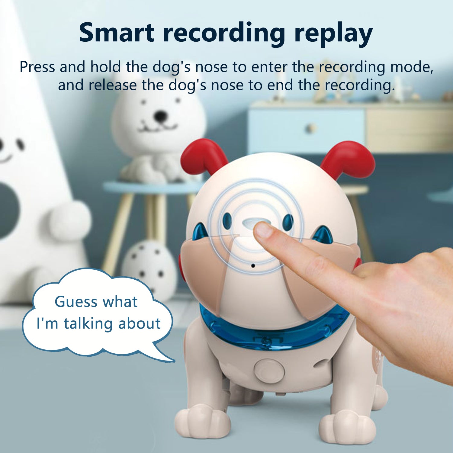 Function: Control the movement and pause of the puppy before and after through the remote control, the puppy will emit different types of music and shine with different colors of lights. Touching the puppy's head or other parts will cause the puppy to react accordingly. Press the dog's nose, turn on the recording function, and then press, you can repeat the voice, press different times, the puppy voice will be different, I wish you a happy game!
